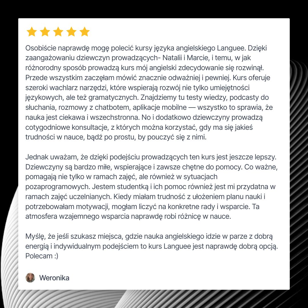 Razem tworzymy unikalne podejście, które nie tylko uczy języka, ale też pomaga pokonać mentalne blokady. To właśnie wyróżnia Languee – uczysz się angielskiego w sposób, który jest dopasowany do Ciebie, z uwzględnieniem Twojego rozwoju osobistego i psychologii. Bo skuteczna nauka to nie tylko wiedza, ale też mindset!